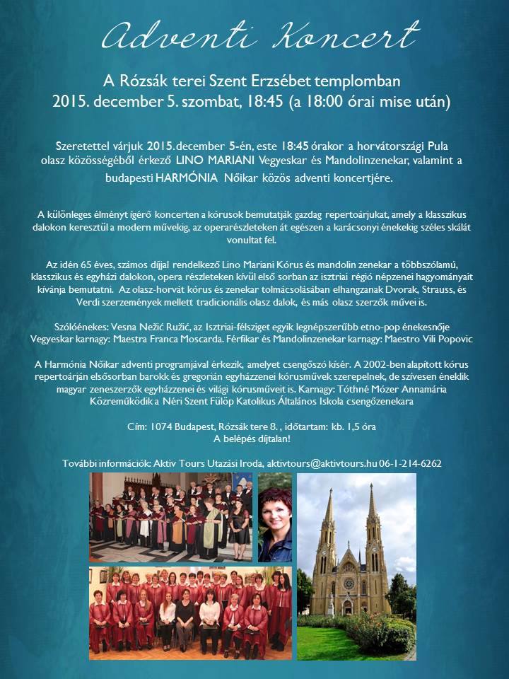 A Harmónia Nőikar és a horvátországi Pula olasz közösségéből érkező Lino Mariani Vegyeskar és Mandolinzenekar közös adventi koncertje.